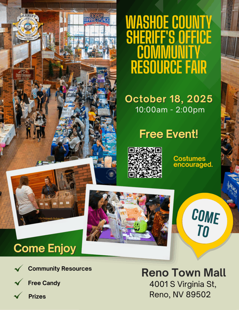 The Washoe County Sheriff’s Office is hosting a Community Resource Fair on Sunday, October 18, 2025, as part of our ongoing efforts to help connect the community with essential services and provide access to resources that meet the diverse needs of our residents.