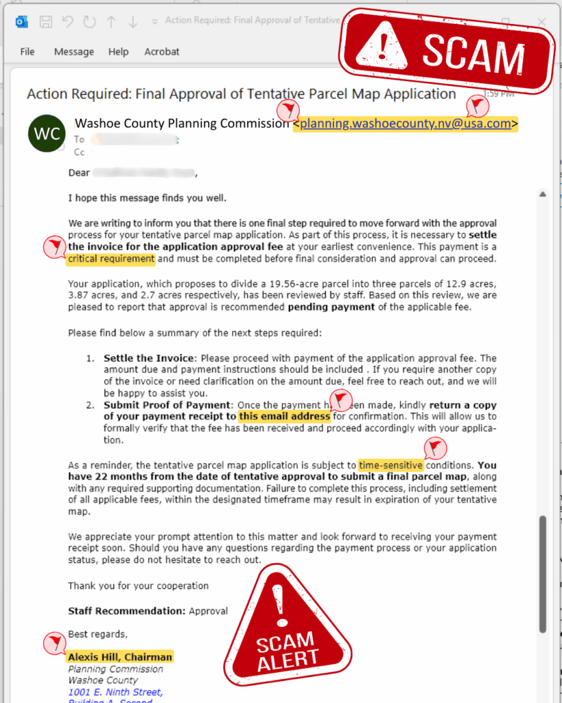 The Washoe County Sheriff’s Office is alerting residents to a fraudulent email scam that is circulating, targeting property owners and applicants for development requests in the unincorporated County. The scam attempts to trick recipients into sending money by posing as officials from Washoe County and the Washoe County Planning Commission.