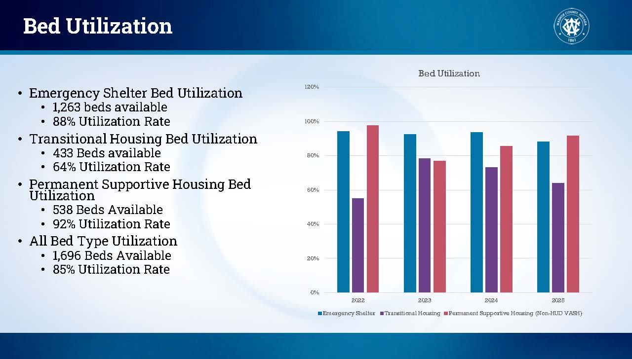 - Utilization overall has increased with Emergency Shelter and Permanent Supportive Housing having higher utilization rates than Transitional Housing